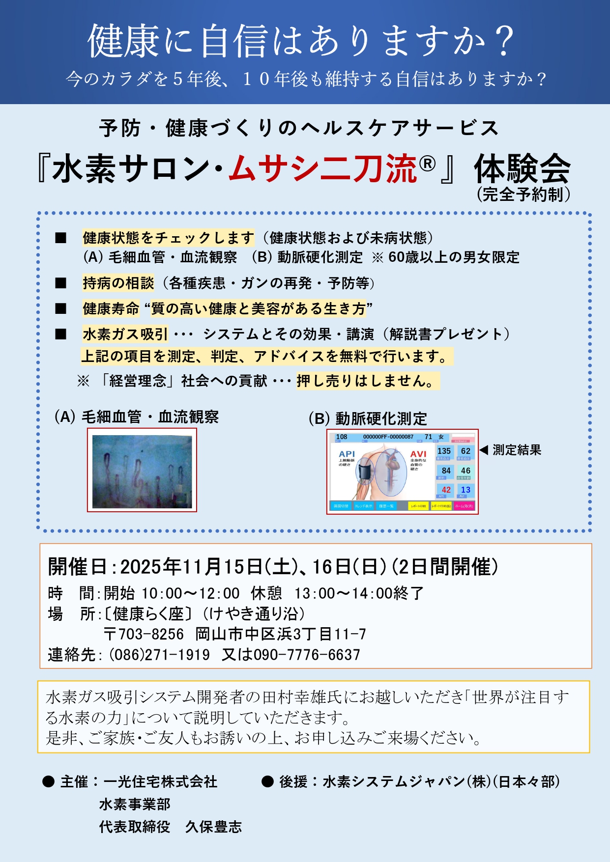今日は十月二十四日、もう秋です。冬がいつ来るのか今年の秋が長いのか短いのか興味が湧きます。さて、健康らく座では十一月十五日(土)、十六日(日)に第二回公開セミナーを行います。水素機のメーカー社長が来てくれて自演指導してくれます。ぜひ参加ください。とてもためになると思います。私は今からワクワクしております。